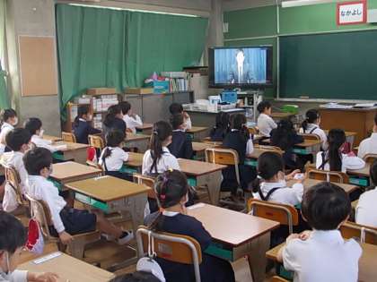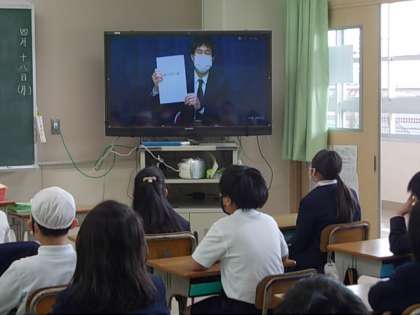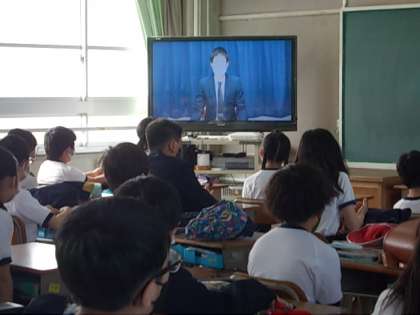 校長先生のお話を聞きました。今日は,「榎っ子の一日」などの学校の決まりについてのお話でした。いろんな決まりは,みんなが安全に気持ちよくすごすためにあります。