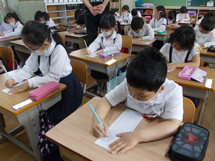 国語では,ひらがなの学習を始まています。今日は「ね」と「ん」を学習しました。これで,「いちねん」と書けるようになりました。みんな,しっかり練習していました。