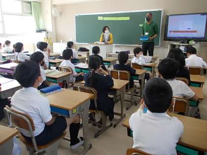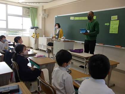 今日の外国語活動には,アメリカ出身のネイティブスピーカーの先生が来てくれました。みんな,先生の自己紹介を熱心に聞いています。