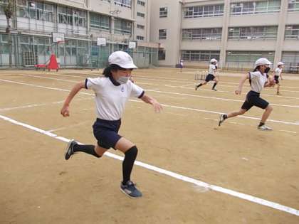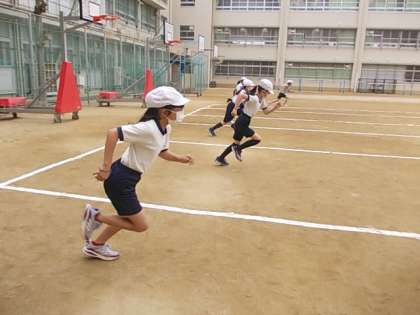 ハードル走の学習が始まりました。この単元では,等間隔に置かれたハードルをリズムよくできるだけタイムロスのないように走り抜けられるよう学習します。まずは,ハードル走での目標タイムの基準となるフラット走のタイム測定に取り組んでいました。