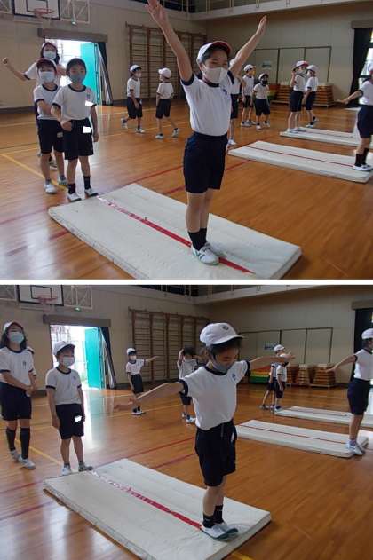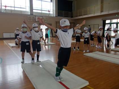 マット運動の学習が始まりました。2年生までのマット遊びではなく,マット運動です。「技」に取り組みます。3年生ではまず前転の習得をめざします。今日は技の終末である「着地」場面に焦点を当てて学習しました。マットの上で一度ついた足を動かさず立ち上がり3秒間そのままキープします。みんながんばっています♪