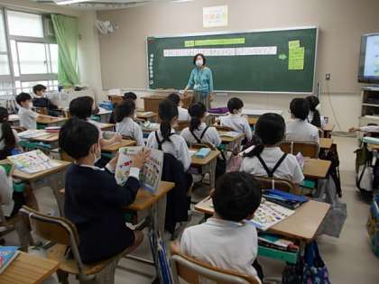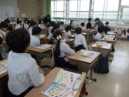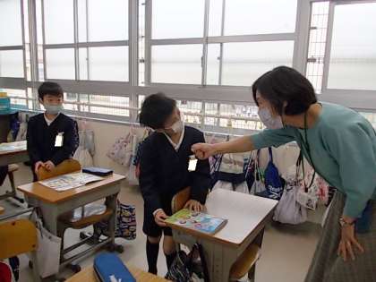 外国語の会話を楽しんでいます。今日は名前のきき方,答え方を学習していました。