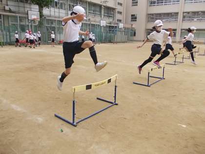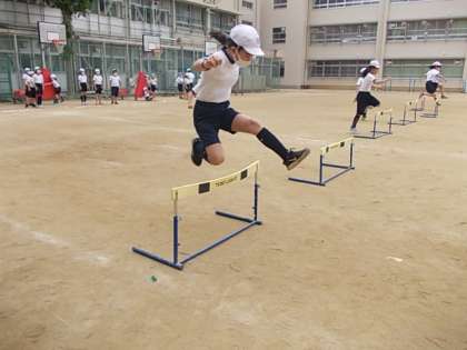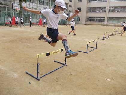 ハードル走の学習に取り組んでいます。今日の課題は,第1ハードルを減速することなく,全速力で走り越すコツを見つけることです。みんな,何度も何度も取り組んでいました♪