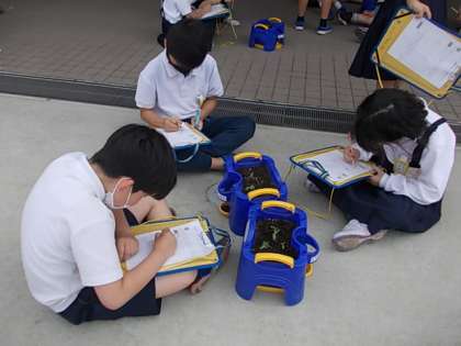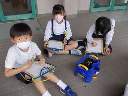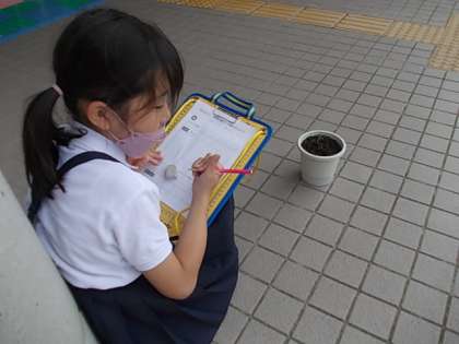 育てているホウセンカとマリーゴールドの芽が出ました。今日はその芽をしっかり見て観察しました♪