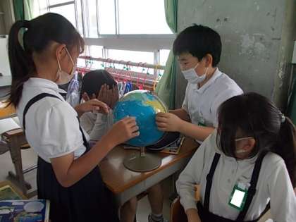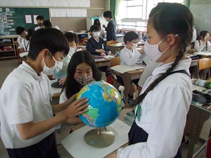 地球儀を使っての学習です。地図帳の世界地図と比較しながら観察しました。