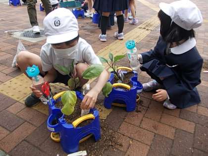 ミニトマト,オクラ,なす,…いろんな夏やさいを育てます。今日はそれぞれが選んだ苗を自分の植木鉢に植え付けました。愛情をこめて育てます♪