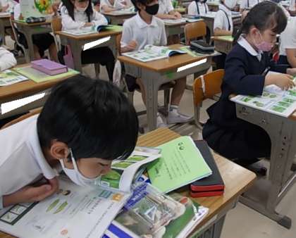 先日,学習園で見つけてきたモンシロチョウのたまごを観察しました。大きさや色,形,いろんな視点で観察をしています。