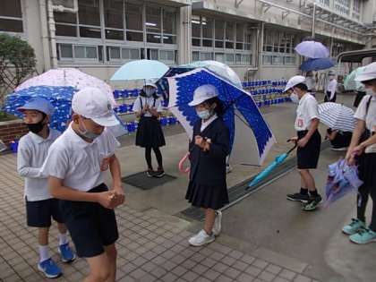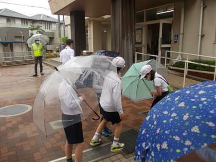 雨の学習です。教室で雨について知っていることを共有した後,実際の雨を観察。降った雨はどこに行くのかな。