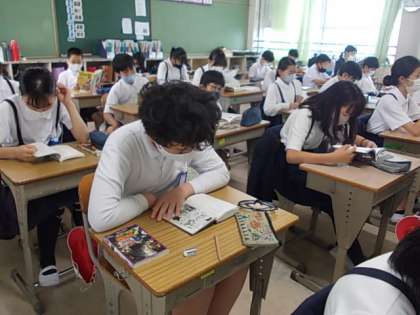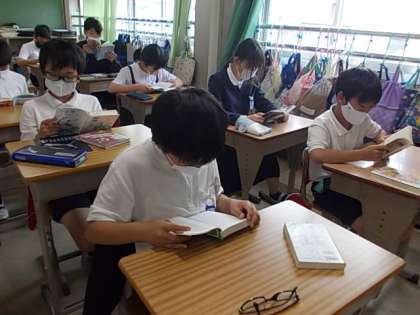図書室で借りてきた本を教室で読みます。ページをめくる音しか聞こえてきません。みんなの集中力にびっくり♪