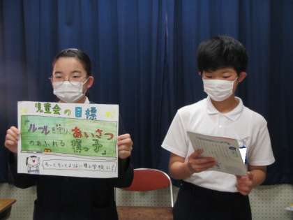 続いて,代表委員のお話です。児童会目標が決まりました。