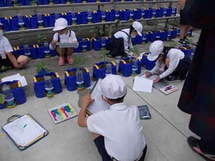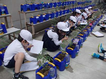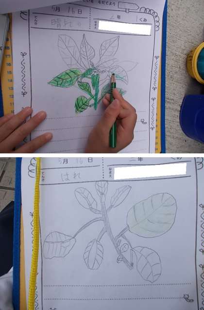 先週植えた夏野菜の様子を観察しました。細かいところまでよく見ています。しっかりメモを取り成長の様子をまとめていきます。