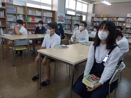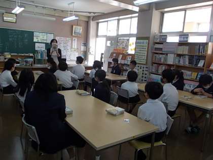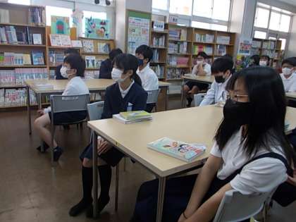 みんなが大好きな図書の時間,授業の初めに司書の先生がおすすめの本を紹介してくれます。みんな,興味津々で聞いていました♪