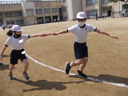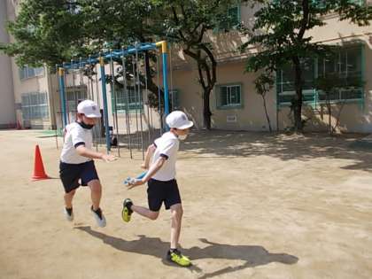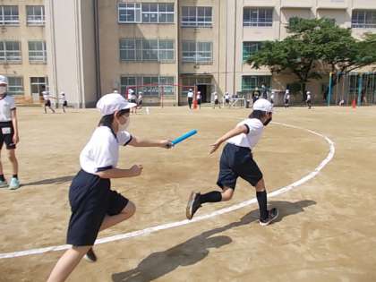 コーナー走,コーナーリレーに取り組んでいます。今日は特に,コーナーでのバトンパスに課題を絞って学習しました。全速力でバトンの受け渡しができるようがんばっています♪
