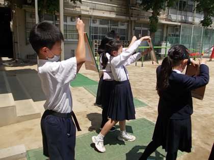 晴れた日の気温の変化を観測しています。地面から1.5メートルぐらいの風通しのよい日陰で測ります。ノートで日陰を作っていました♪