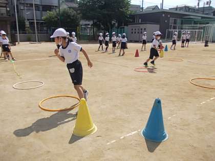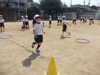 コーンやフラフープのまわりを回ったり,ロープに沿って走ったり,自分たちで工夫して楽しいランニングコースを作成しました。みんな,生き生きと活動しています♪