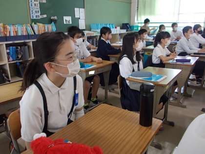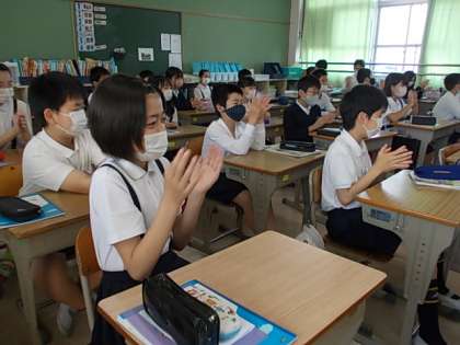 今日から1学期末までの間お世話になる家庭科の先生が来てくださいました。大きな拍手で迎えられていました。