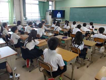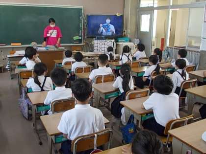 校長先生のお話を聞きました。1年生が育てているあさがおの芽が出てきたこと,堺市のコロナ感染警戒レベルが「1」となったこと,についてのお話でした。