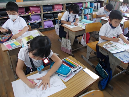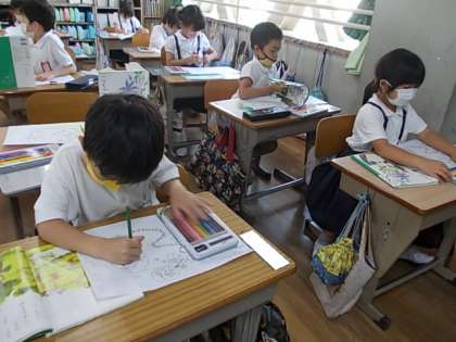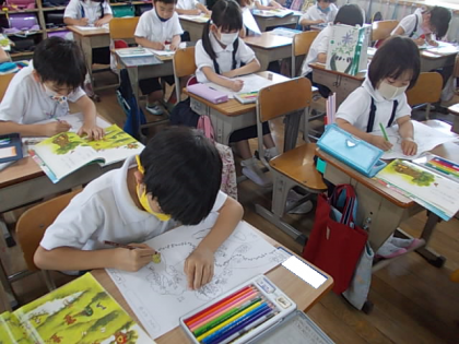 物語「はなのみち」の学習です。登場人物はどんなことを言っているかな。物語に書かれていない会話文を想像して,ワークシートに書き込んでいました。