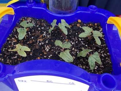 あさがおの芽が出てきました。さっそく観察しました。うれしいね。
