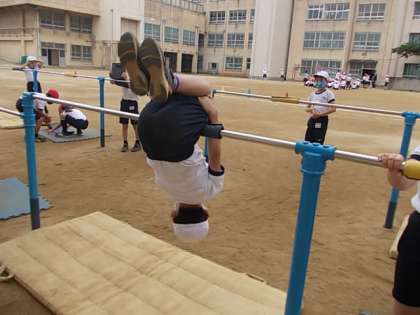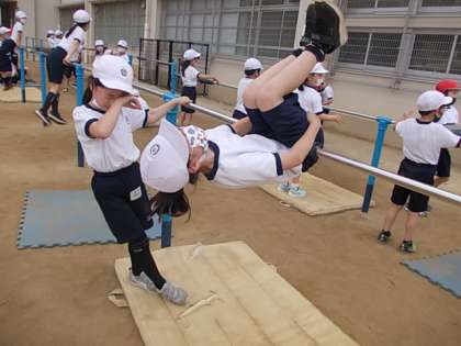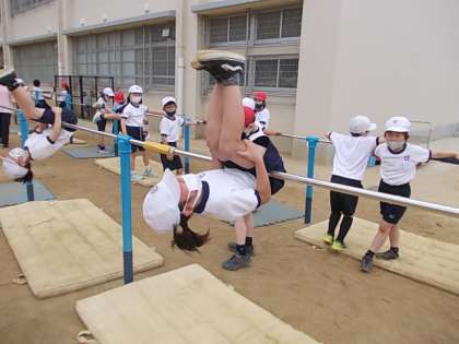 みんな,どんどん上手になっています。大きく体を触れるようになったけど,あと少しのところで回転にならない児童が多く,「あと少し」のポイントを探っています。