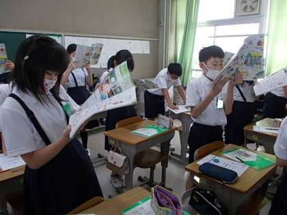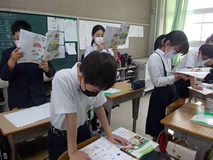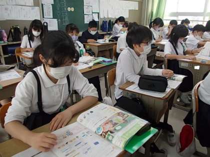 裁縫の学習が始まります。今日は裁縫道具一つ一つの名前と役割について学習します。「安全」についても同時に学習します。しっかり教科書を読み込んでいます。