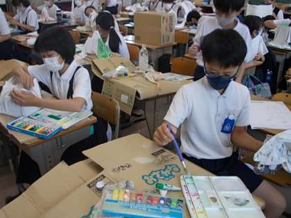 タオルを固めてアートに!みんな,イメージをふくらませユニークな作品を作り上げています♪