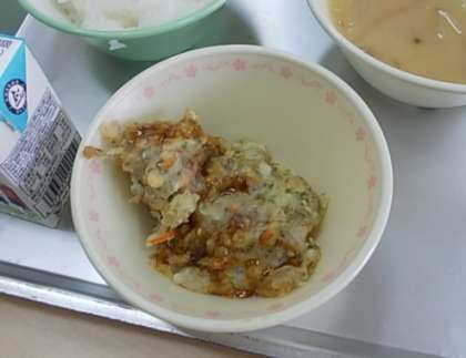 6月4日から10日は,「歯と口の健康週間」です。今日の「カルちゃん焼き」は歯を強くするカルシウムがいっぱい入ったお好み焼きです。カルシウムが多いちりめんじゃこ・ごま・牛乳が入っています。