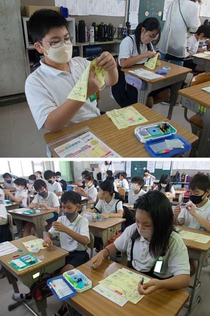 裁縫,がんばっています。ボタンも自分でつけられるようになりました。次はなみ縫いです。先生の説明をしっかり聞いています♪