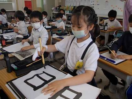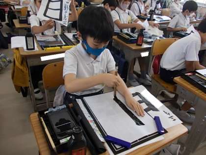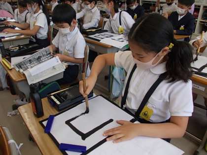 筆を立てて,大胆に筆を動かします。今日の課題は「日」でした。みんな立派な大きな字を書けています♪