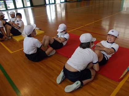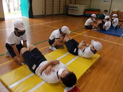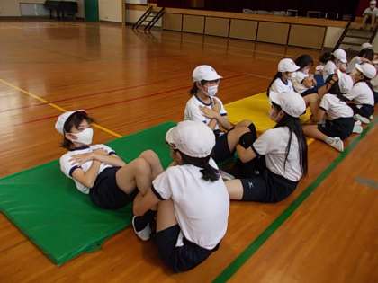 新体力テストの上体起こしに取り組んでいました。腹筋の持久的な力を測定します。30秒間で何回上体を起き上がらせることができるかな。