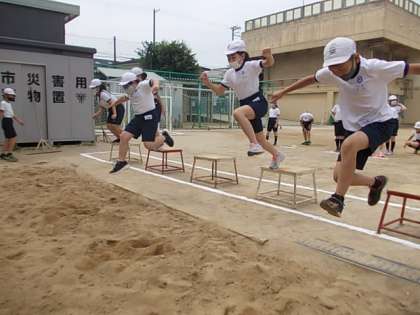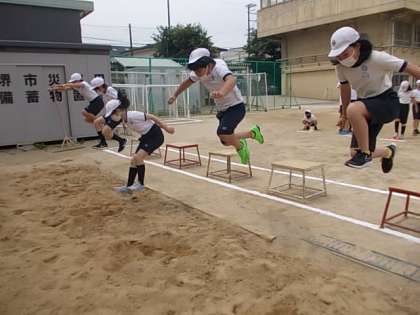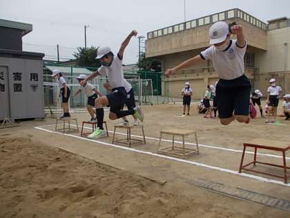 走り幅跳びの学習が始まりました。今日は走り幅跳びのおもしろさを探ります。ウォーミングアップとして,踏み台を使ってのジャンプをしています。ひざをやわらかく使って安全に着地する練習です。