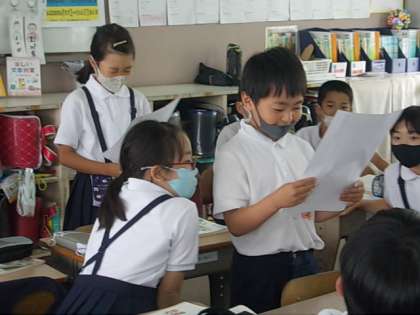 接続語の学習をしています。一つの文章についていろんなつなぎ言葉を使って,文をつなげていきました。一人一人のユーモアあふれる文章になっており,楽しい交流会となりました。