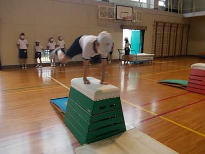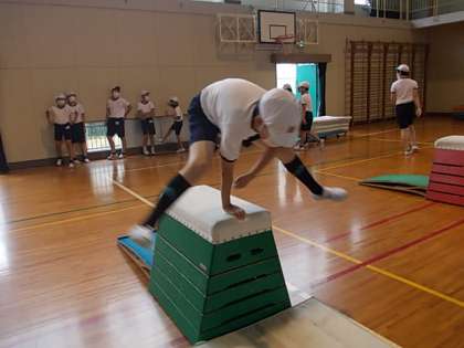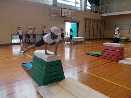 跳び箱の学習です。ダイナミックに跳び,ぴたっと着地を決めます♪