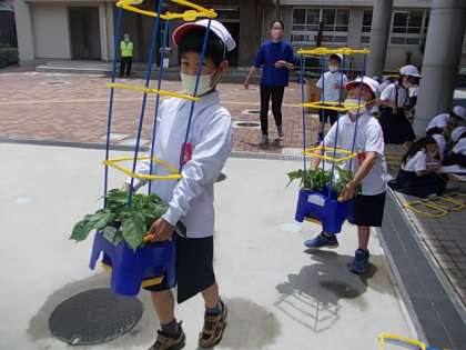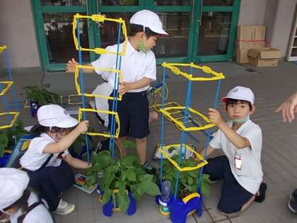 あさがおがどんどん成長しています。今日はその成長を支えるための支柱を立てました。