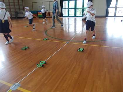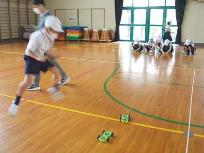 ゴムの力で車を前に進めます。ゴムを引っ張り具合と進む距離の関係を考えていました♪