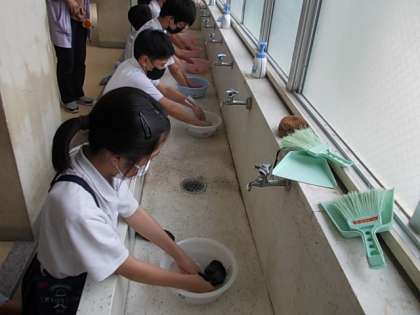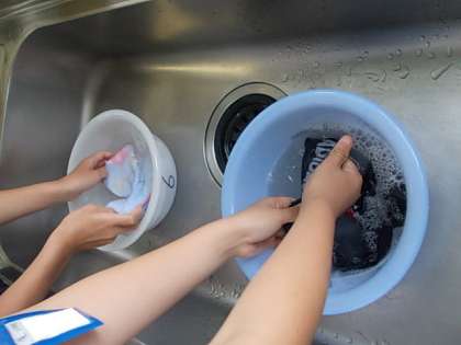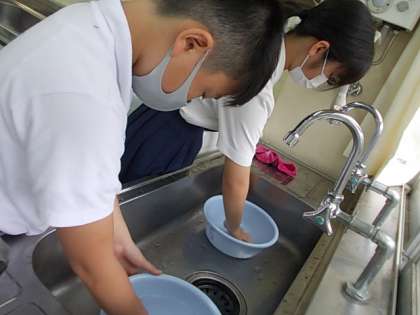 今日は,洗濯の実習をしました。自分の靴下やタオルを,洗剤を使って洗いました。