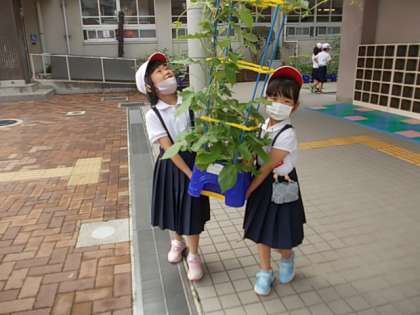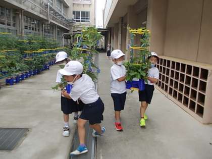 昨日,台風の風を避けるため室内に避難させていたあさがおをいつもの場所へ戻しています。みんなで協力して作業を進めています♪