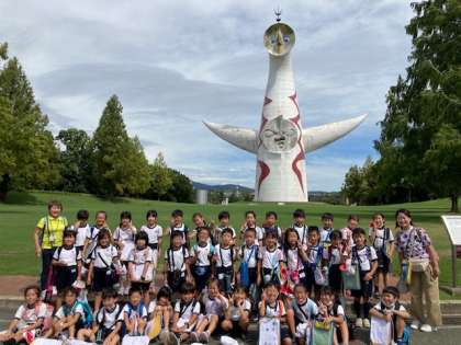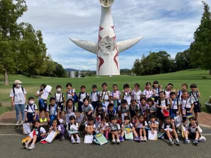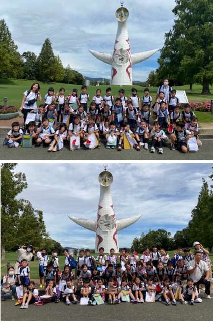 太陽の塔の前での記念撮影です。はい,チーズ!