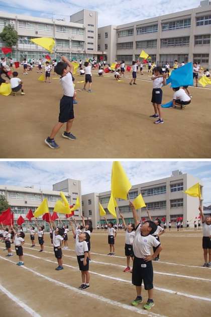 フラッグの動きをみんなで合わせられるよう,細かい動きをみんなで確認しながら練習を進めていました♪