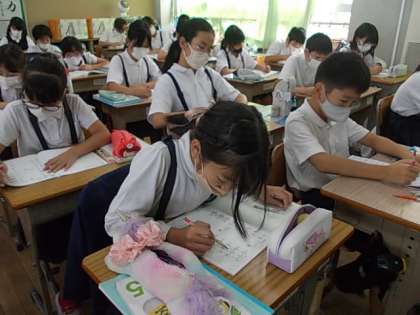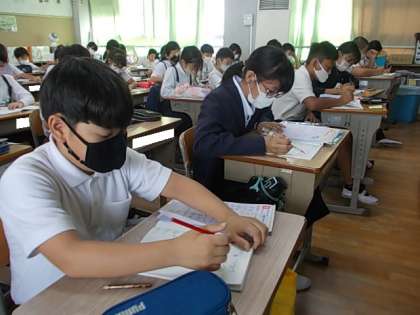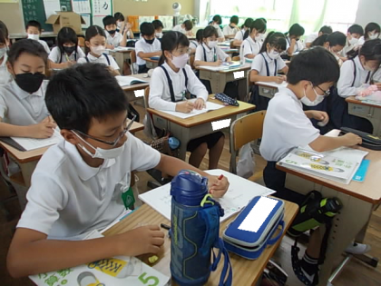 宿題でがんばってきた計算ドリルの答え合わせに取り組んでいました。分数のたし算に取り組んでいます♪