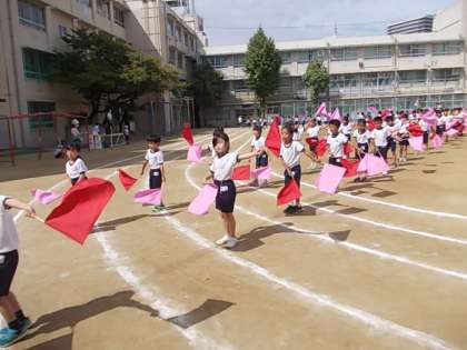 歌詞の「わたしはつばめ」に合わせ旗をはばたかせます。かわいらしい♪