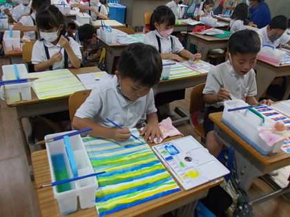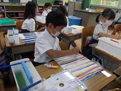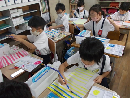 10月4日(火) 1年生図工「横じま模様作成中」♪