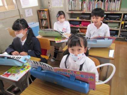 「しあわせのうた」の2部合奏に挑戦します。まずは先生が一人で演奏してくれるお手本を聴きました♪