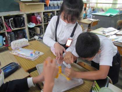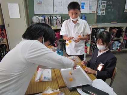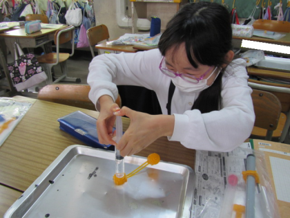 空気と水の性質の違いを探っています。注射器に水を満たし,押し込んでみました。さて,空気とのちがいは…