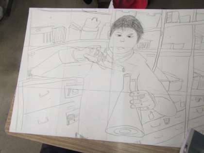 いろんな実験器具を扱っている自画像に挑戦しています。顕微鏡,ビーカー,上皿てんびん,…いろんな道具を中心に描き進めています♪
