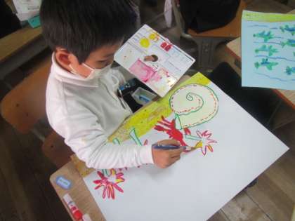 工夫して絵の具で色ぬりをしています。絵本を題材にした作品だそうです。ヤドカリは次はどこの部屋へ行くのかな??