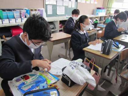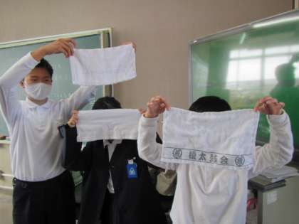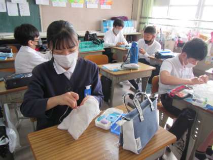 手縫いでぞうきんを作成しています。一針一針,丁寧に縫い進めていました♪