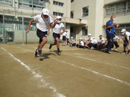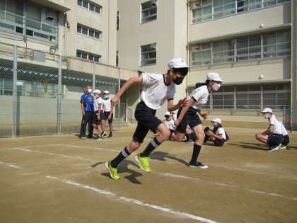 来週の陸上運動記録会に向けての練習です。100m走,50mH走に出場するメンバーは,スタートダッシュの練習中!