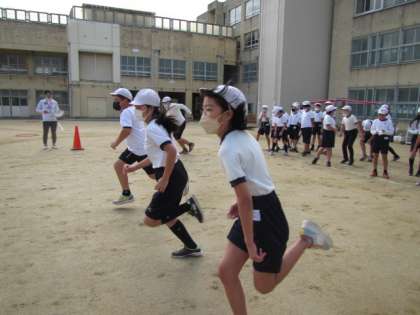 体育の時間のウォーミングアップの様子です。心と体をポカポカにします♪