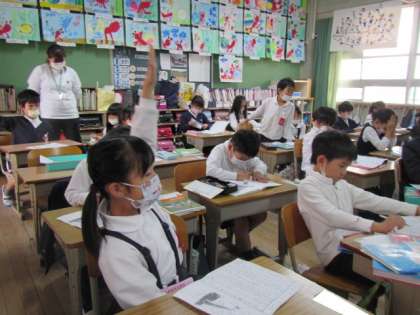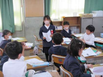 説明文「じどう車くらべ」の学習です。それぞれのじどう車がどのように説明されているかを考えています。3つのじどう車が「しごと」「つくり」の順で説明されていることがわかりました。